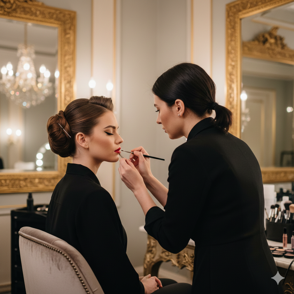 Combined hair and makeup styling.